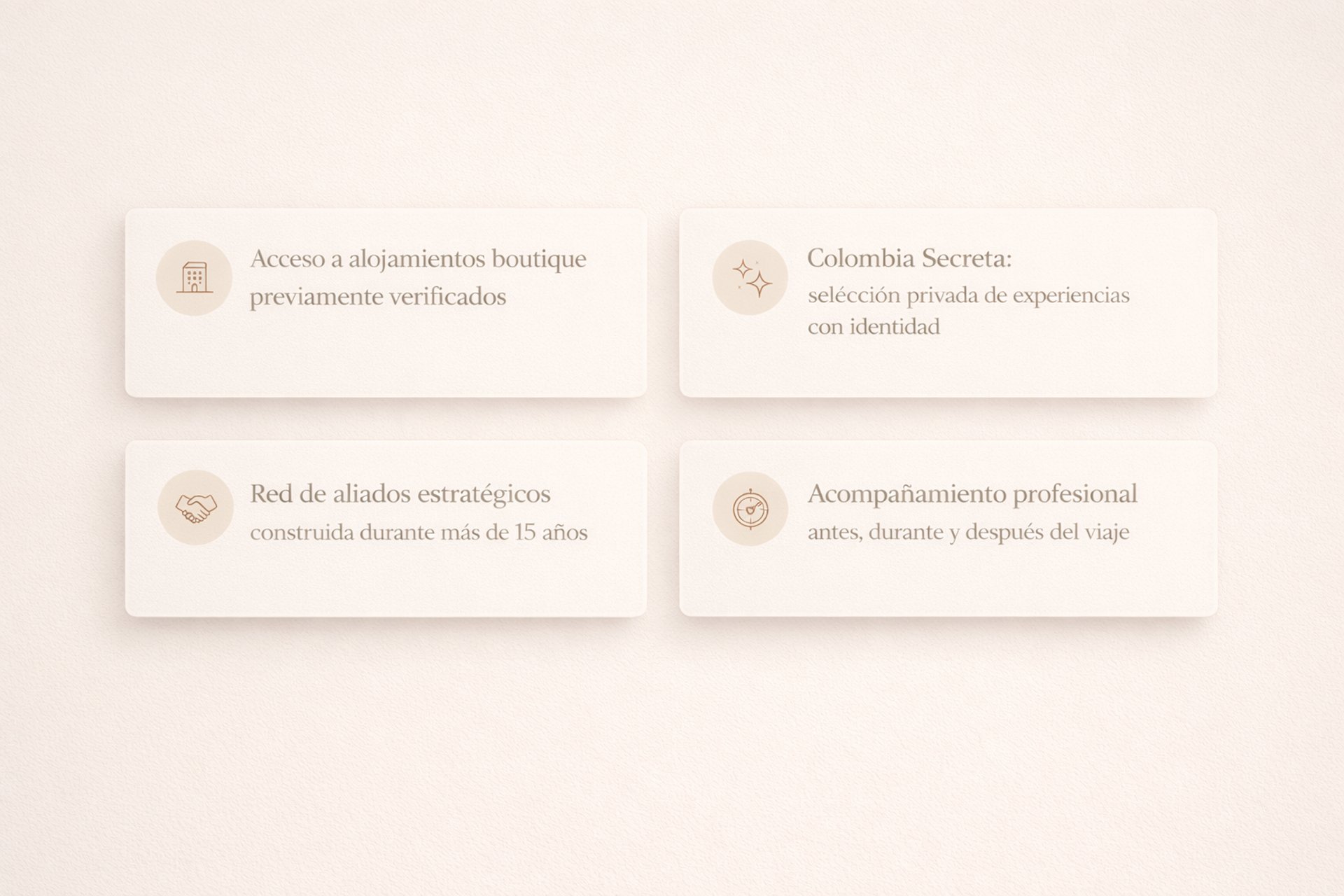 Seleccionamos alojamientos, experiencias y detalles que realmente aportan valor. Acceso a propiedades y aliados cuidadosamente elegidos.